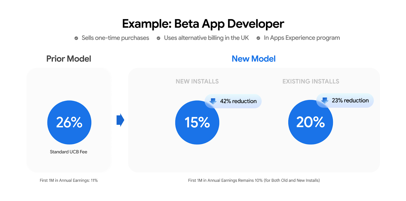 Service Fees: For new installs (first time installs from users after the new fees are launched in a region), we are reducing the in-app purchase (IAP) service fee to 20%.