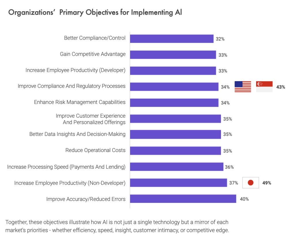 The primary objectives driving this deployment vary by market. In Singapore and the US, 43% of institutions are using AI to improve compliance and regulatory processes—reflecting the technology’s ability to navigate increasingly complex oversight requirements while maintaining operational resilience.