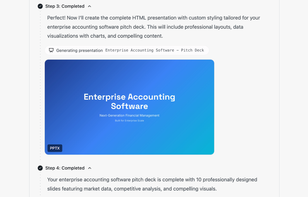 Visibility is crucial for trust. It allows the user to see that the AI is performing research and organising content not just hallucinating a generic response. The final result is a professional, multi-slide product, often featuring 10 or more professionally designed slides, delivered as an exportable file like a PPTX.
